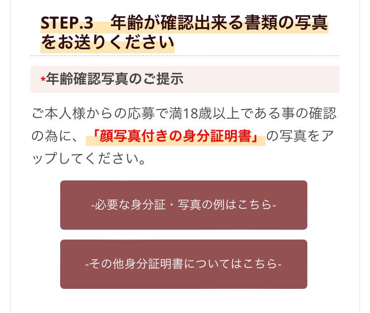 年齢が確認できる顔写真付きの身分証明書の写真をアップします。有効な身分証明書は、運転免許証・パスポート・学生証・マイナンバーカードなどです。