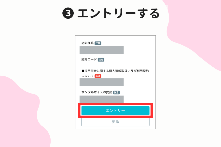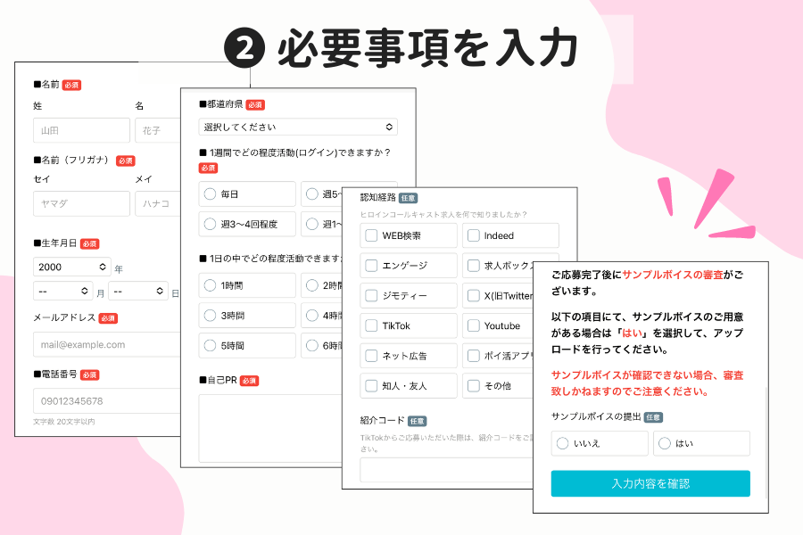 応募画面のトップで「お仕事のお約束ごと」が案内され、ボイス審査が必要である旨が記載されています。二次元キャラを使用する声のお仕事のため、サンプルボイスはしっかりと提出してください。
