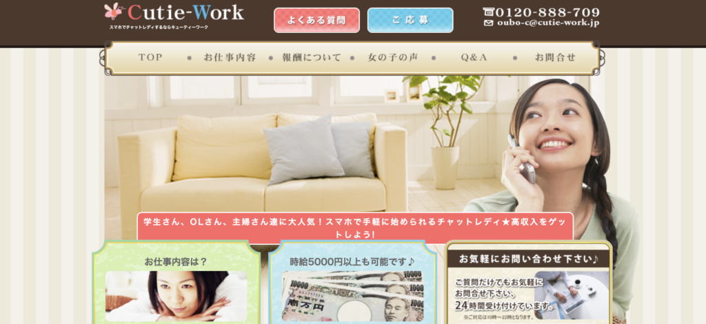 キューティーワークとは、スマホやパソコンを使ってメールや通話で収入を得られる、女性向けのメールレディ・チャットレディ登録サイトです。